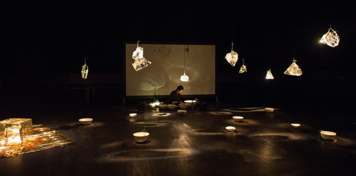 Tomoko Sauvage, artiste franco japonaise, joue avec l’eau, la glace, le larsen, la céramique… Elle nous explique comment le son d’un instrument sonne tellement différemment ici ou là, par exemple au Japon et en France. Comment l’humidité ambiante peut faconner un son, ou le desservir, l’apauvrir. Comment d’une culture à l’autre, la musique, le son, sont modelés par le geste, l’objet sonnant, la matière, l’instrument, et bien sûr la posture, la philosophie du joueur…. Comment elle a choisi, à l’aune de ses multiples expériences dans différents pays, de faire chanter des bols de porcelaine, et des gouttes d’eau fondant de glaçons suspendus…