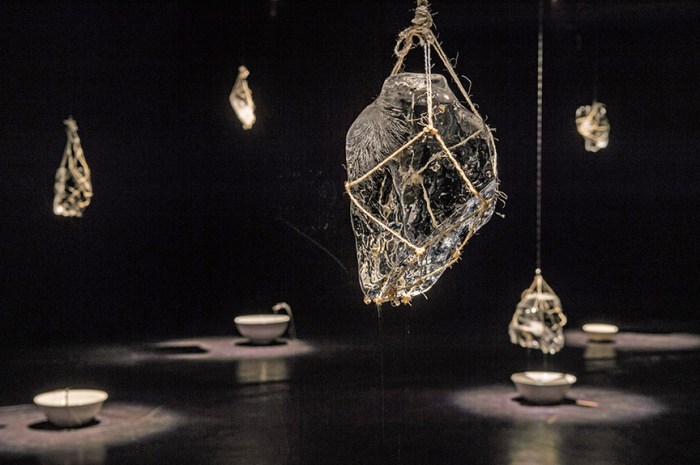 TOMOKO SAUVAGE, In Curved Water, 2015, sound installation with water drops, Sisal ropes, ice, water, porcelain bowls, hydrophones and sound system, dimensions variable. Courtesy The Empty Gallery, Hong Kong.
