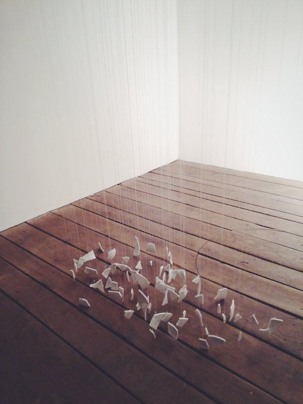 L’exposition est également une évocation du temps qui passe, de l’éphémère et du transitoire. Fonte de la glace, changement d’état de la matière, chute d’une goutte d’eau, brefs sons clairs et tintements, tesselles de porcelaines suspendues tissent un univers fragile qui, tel un paysage neigeux, sous l’apparente immobilité ne cesse de se transformer. L’exposition s’organisera principalement d’une version pensée pour Le Bon Accueil de son installation pour glace et bols amplifiés, ainsi que d’une nouvelle oeuvre constituée de fragments de porcelaine suspendus tintant au moindre souffle d’air.
