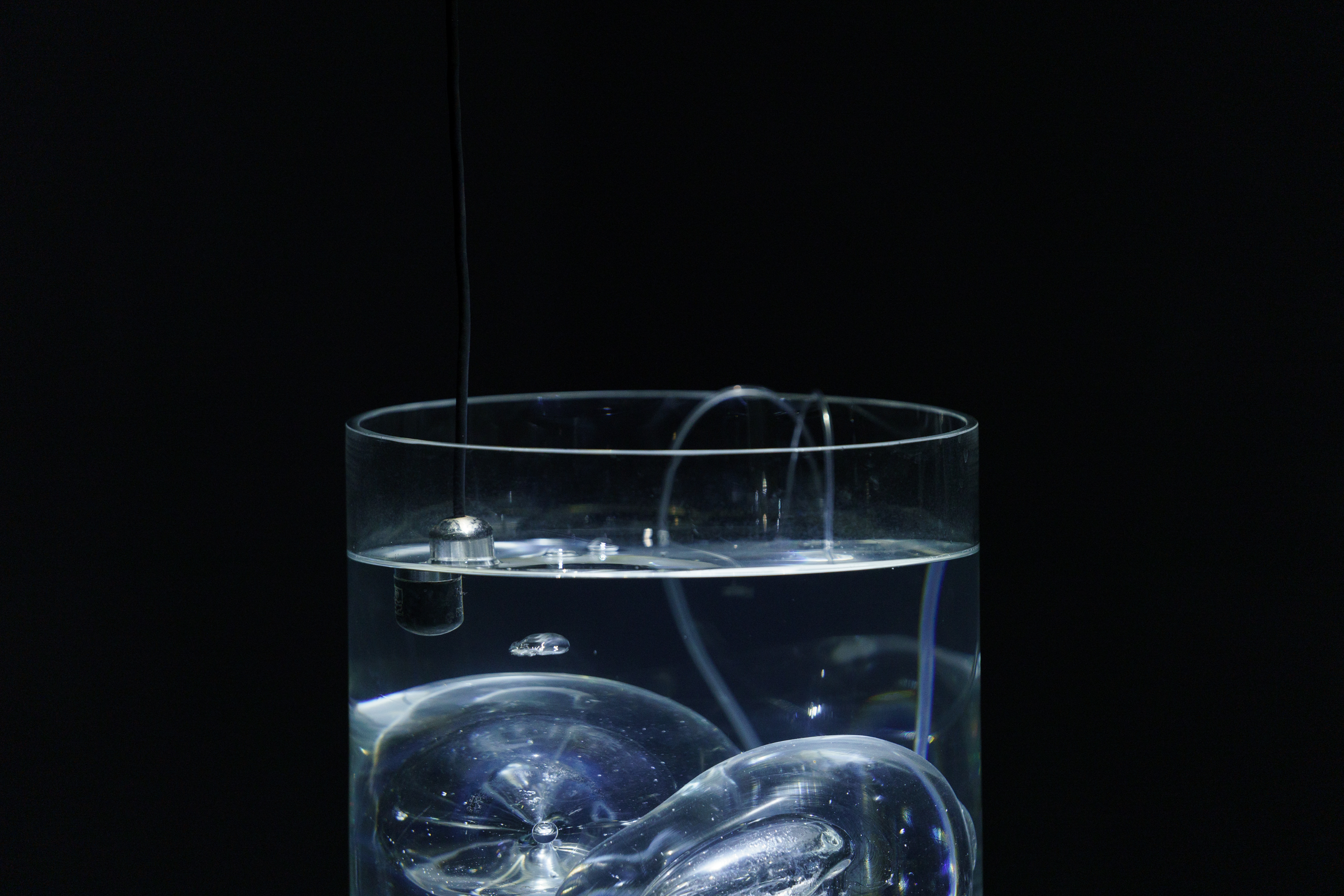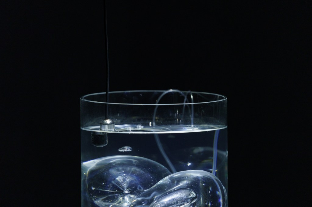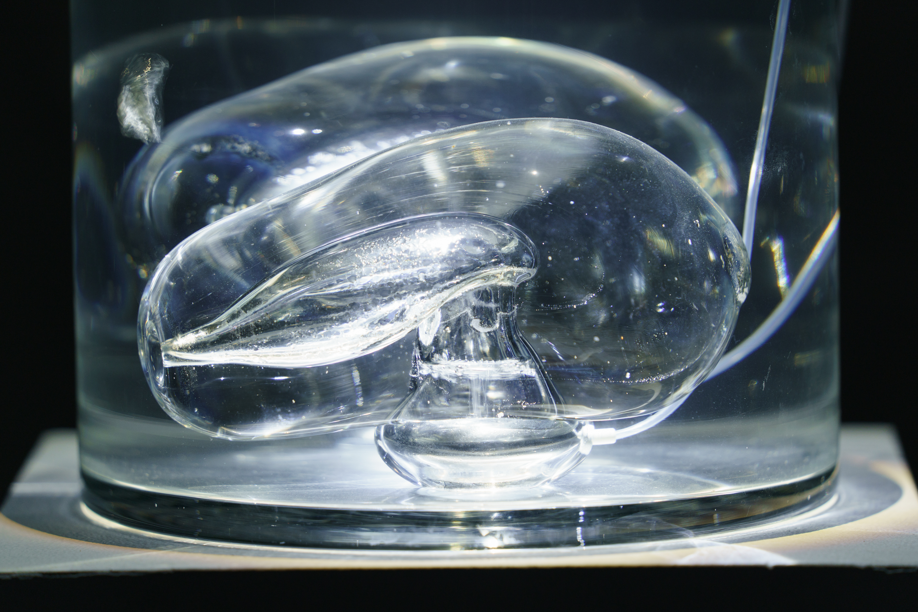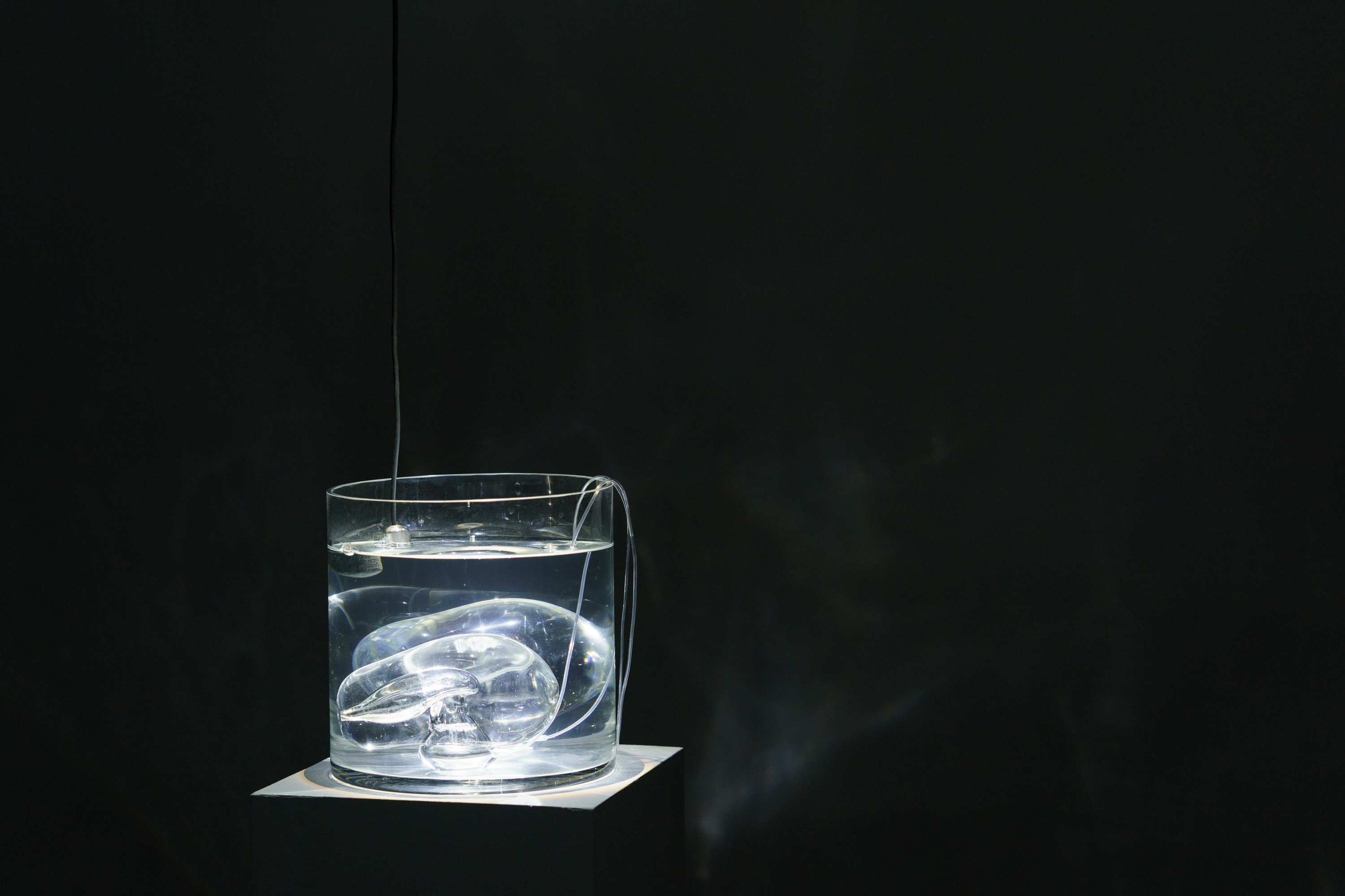 Buloklok, assembled with glass sculptures that emit air bubbles in amplified water, is imagined as a timepiece that counts a multitude of breathing patterns of different animals. Adopting Sauvage’s performative practice of using cowrie shells as musical instruments that produce bubbles sound, the installation works as an aquatic wind instrument automated by air pumps. The sculptures bring out bubbles from their “mouths” each time the upper part of their cavities are filled with air, generating varied notes and rhythms depending on the size of their cavities and the air pressure.