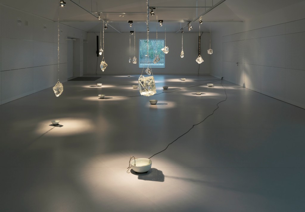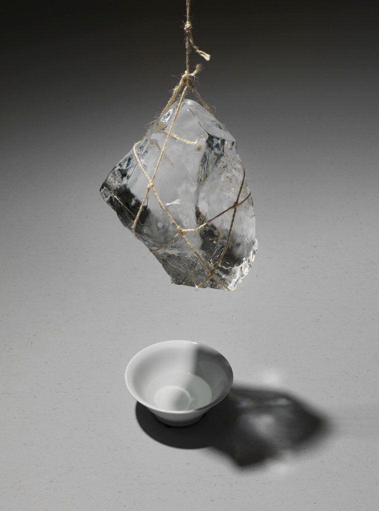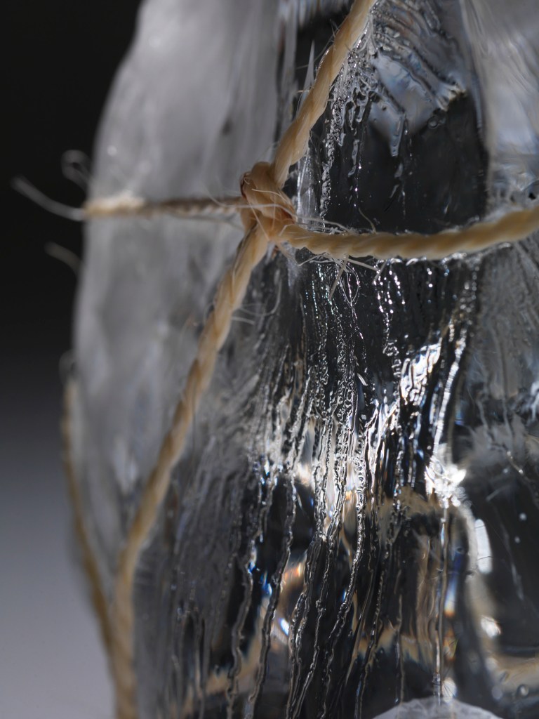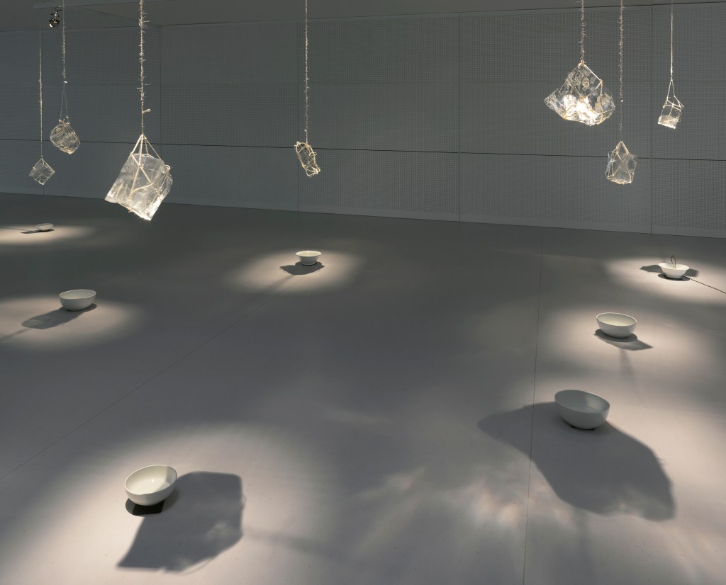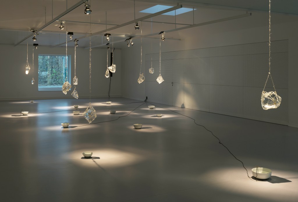In Curved Water Ice, cisal ropes, porcelain bowls, water, hydrophones, sound system (2010) Photos by Jen Ziehe