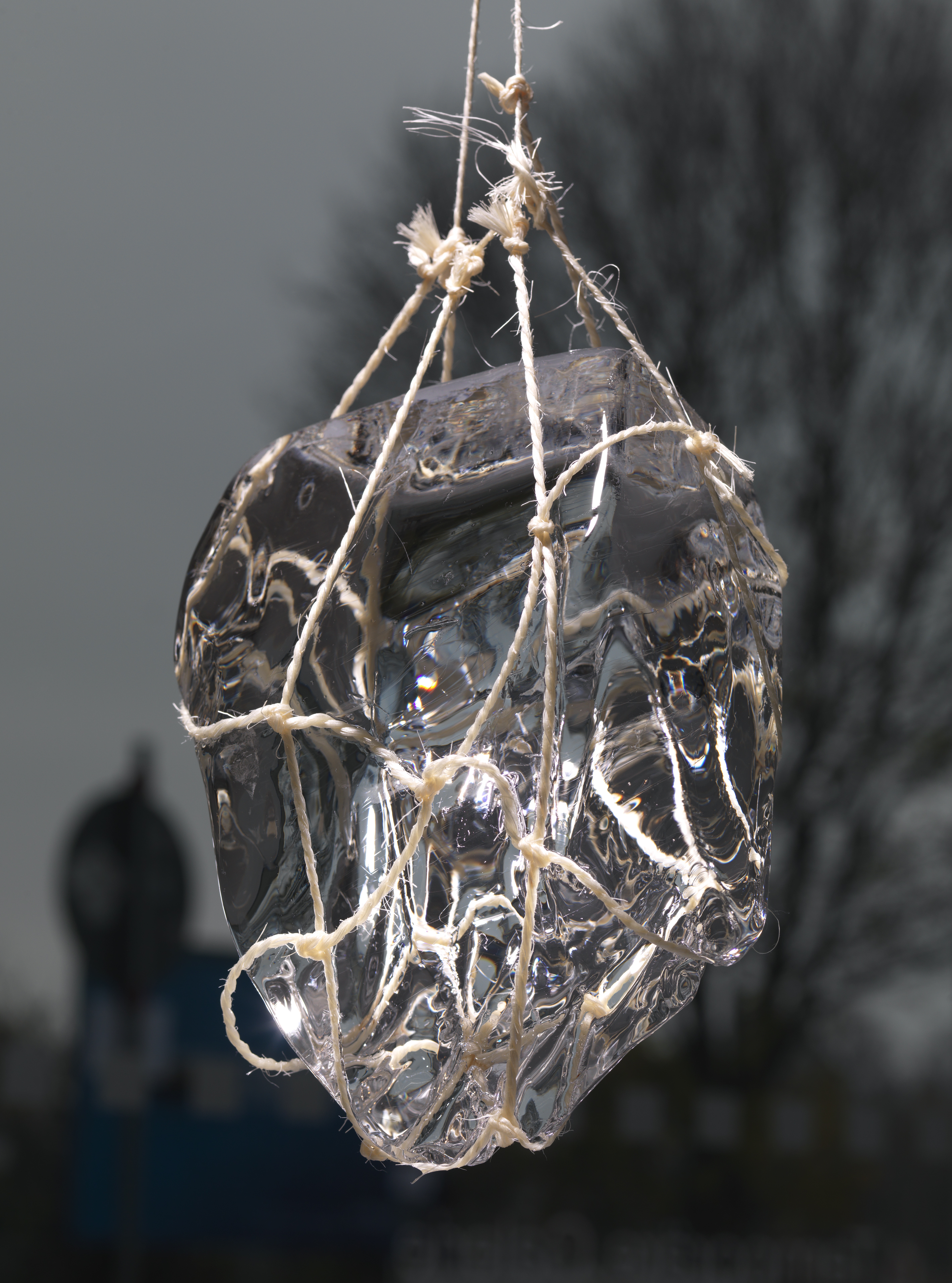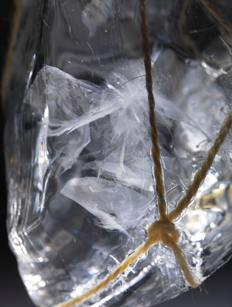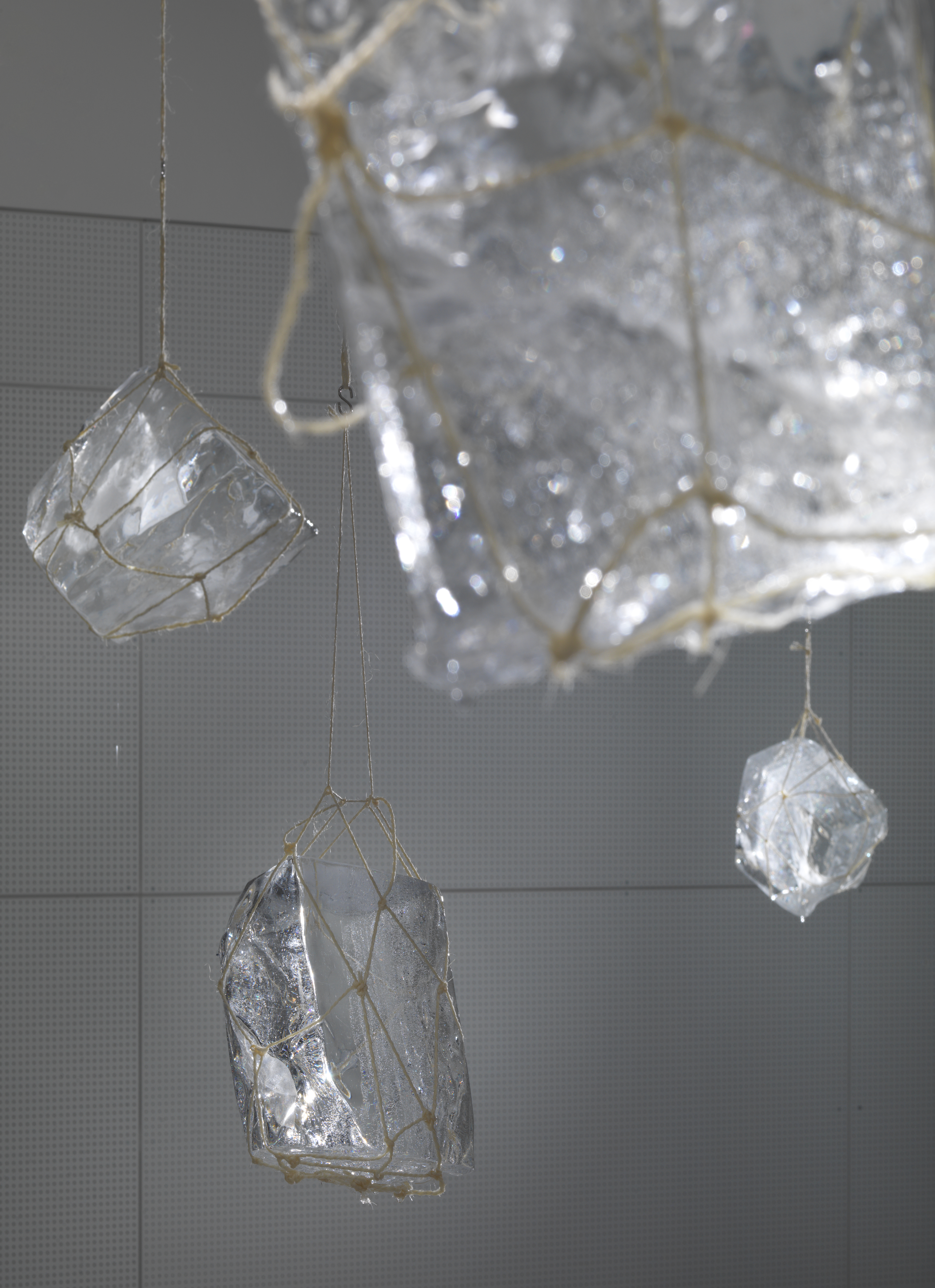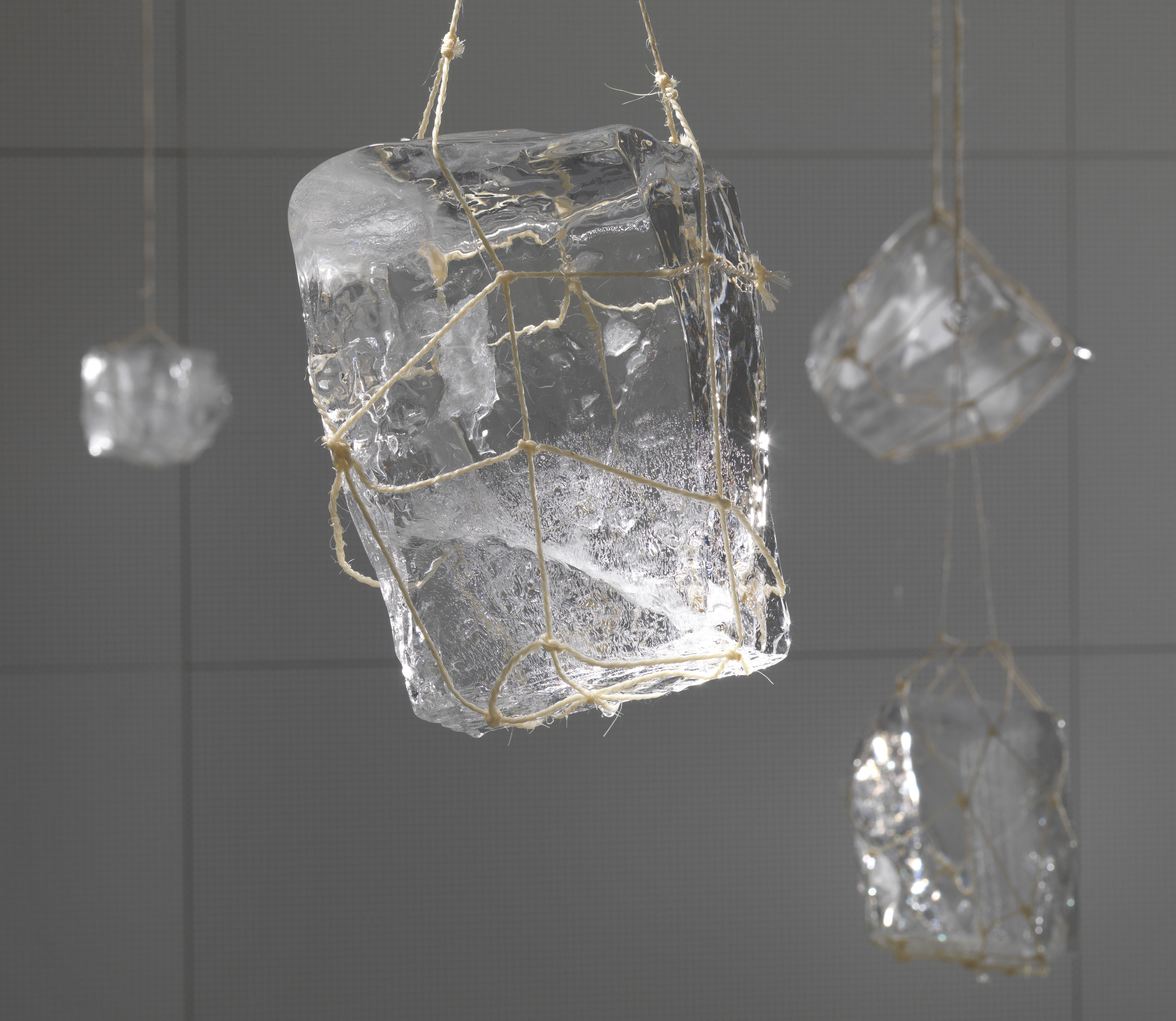 In Curved Water Ice, cisal ropes, porcelain bowls, water, hydrophones, sound system (2010) Photos by Jen Ziehe
